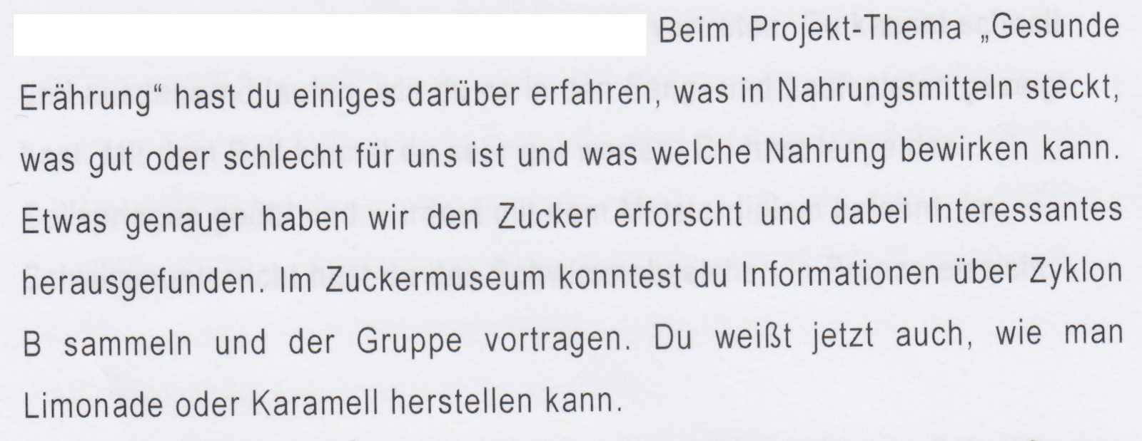 Kurz zur Erklärung: Ein Lernbrief ist eine Art Zeugnis ohne Noten, in dem tendenziell sehr wertschätzend aufgeschrieben wird, was das Kind im angegebenen Zeitraum gelernt hat; ebenfalls erwähnt wird, worin Stärken des Kindes liegen und woran zukünftig noch gearbeitet werden sollte. In besagtem Lernbrief folgte nach Erwartbarem zu Lesen, Schreiben, Rechnen, Sport dies: