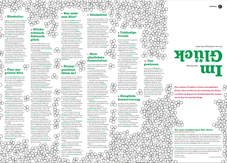 Dieses »Klee-Blatt« ist die Möglichkeit einer Wiese: Hier kann und will Glücksklee gesucht werden, jedes Blättchen mit dem Kugelschreiber oder dem abgenagten Bleistift ausgemalt oder eingekreist oder mit Goldstift nachgezogen werden. Gib’s dem Kind, wenn’s kräht, male selbst drin rum, pause es ab – mach’ doch, was du willst! Gönn’ dir ein paar Minuten im Grünen, einfach zum eigenen Vergnügen. Lege gefundenen Klee hinein, schenke es weiter, behandle es mit Liebe und Unernsthaftigkeit. Dafür ist es nämlich da.